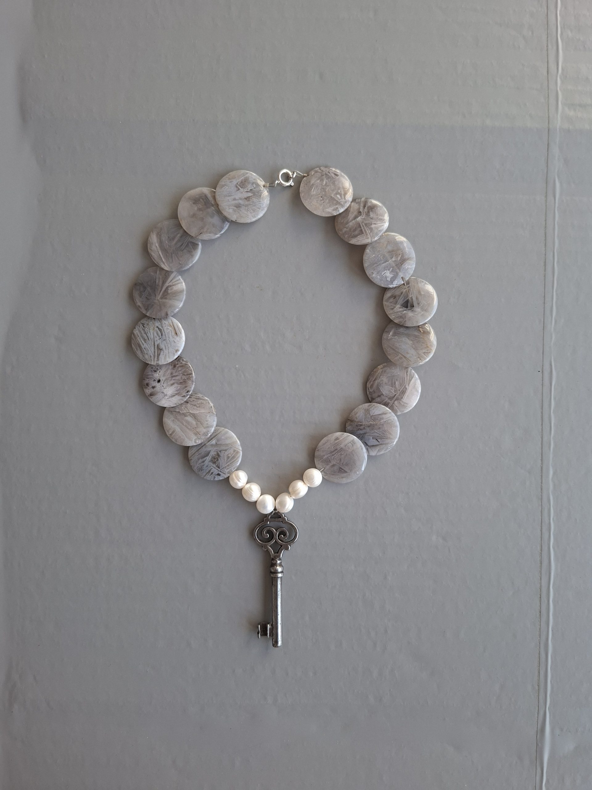 Lucky-Day-Halskette Halskette aus Achat-Flachperlen (hat beruhigende und schützende Eigenschaften, stärkt das Bewusstsein und den inneren Frieden, Talisman für Reisen und Neuanfänge) mit hübschem, alten Schlüssel als Herz-Öffner