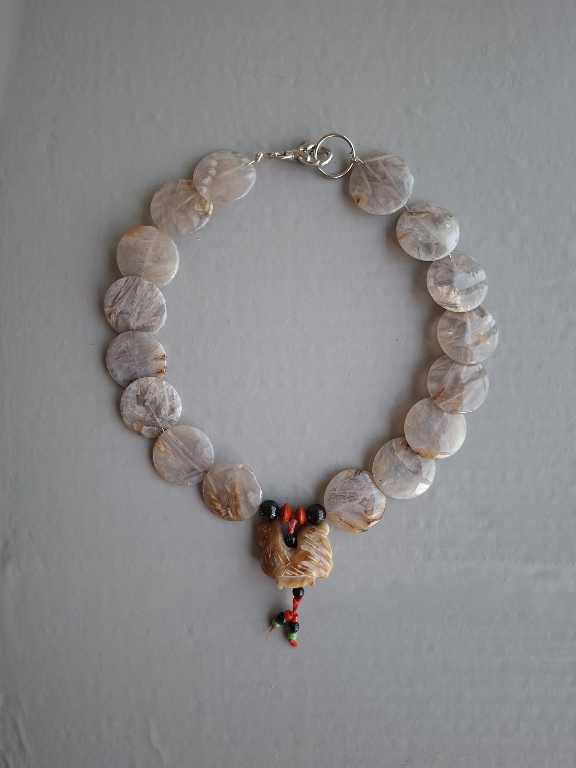 Sehr aparte, ungewöhnliche Halskette aus Achat-Flachperlen (hat beruhigende und schützende Eigenschaften, stärkt das Bewusstsein und den inneren Frieden, Talisman für Reisen und Neuanfänge) und chinesischem Huhn als Glücksbringer (Symbol für Wohlstand, Fruchtbarkeit und Schutz)