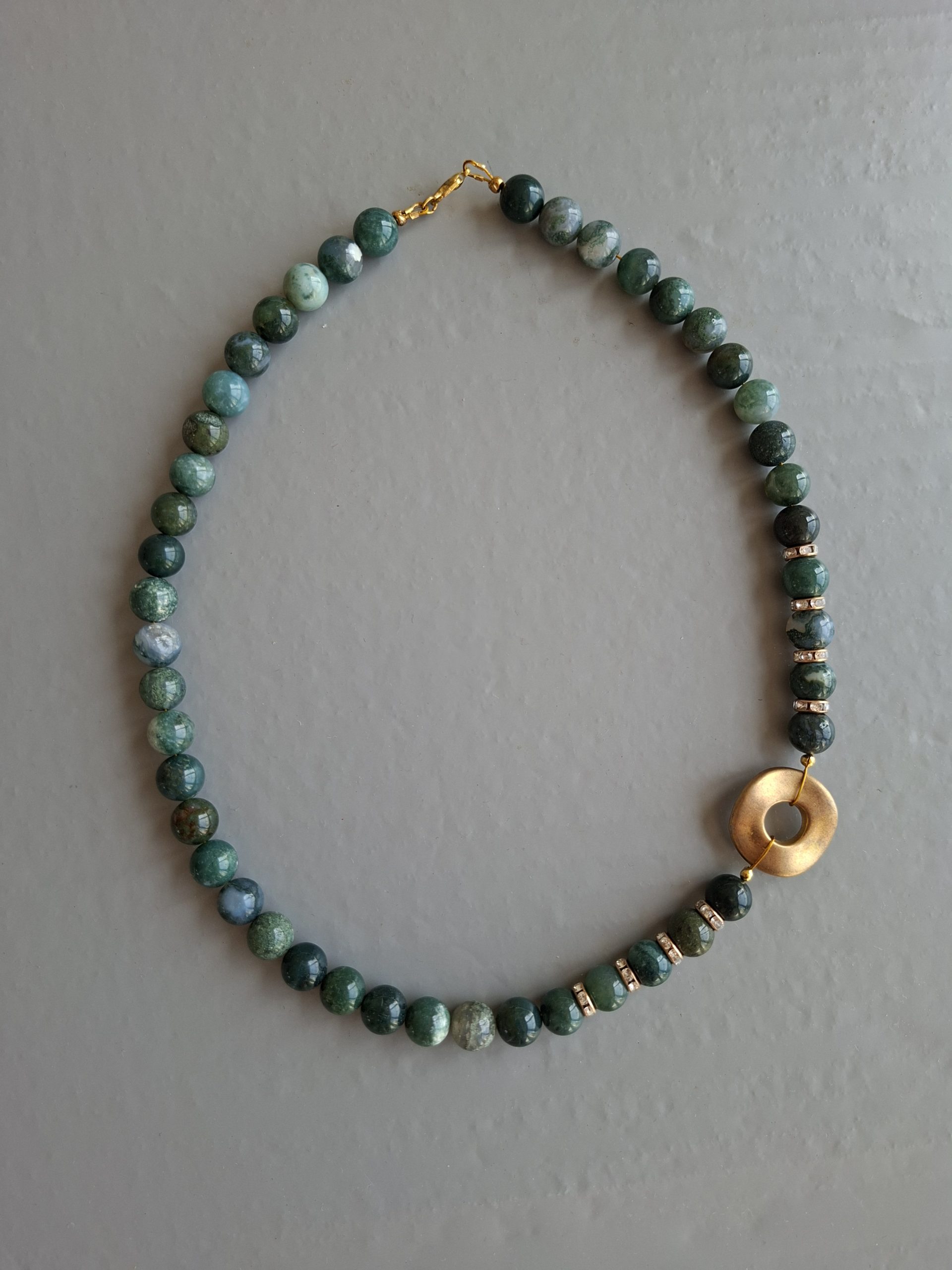 Stilvolle, asymmetrische Moosachat-Halskette (hilft, seelischen und Stressdruck zu erleichtern, unterstützt Leichtigkeit und Inspiration, wirkt Ängsten entgegen)