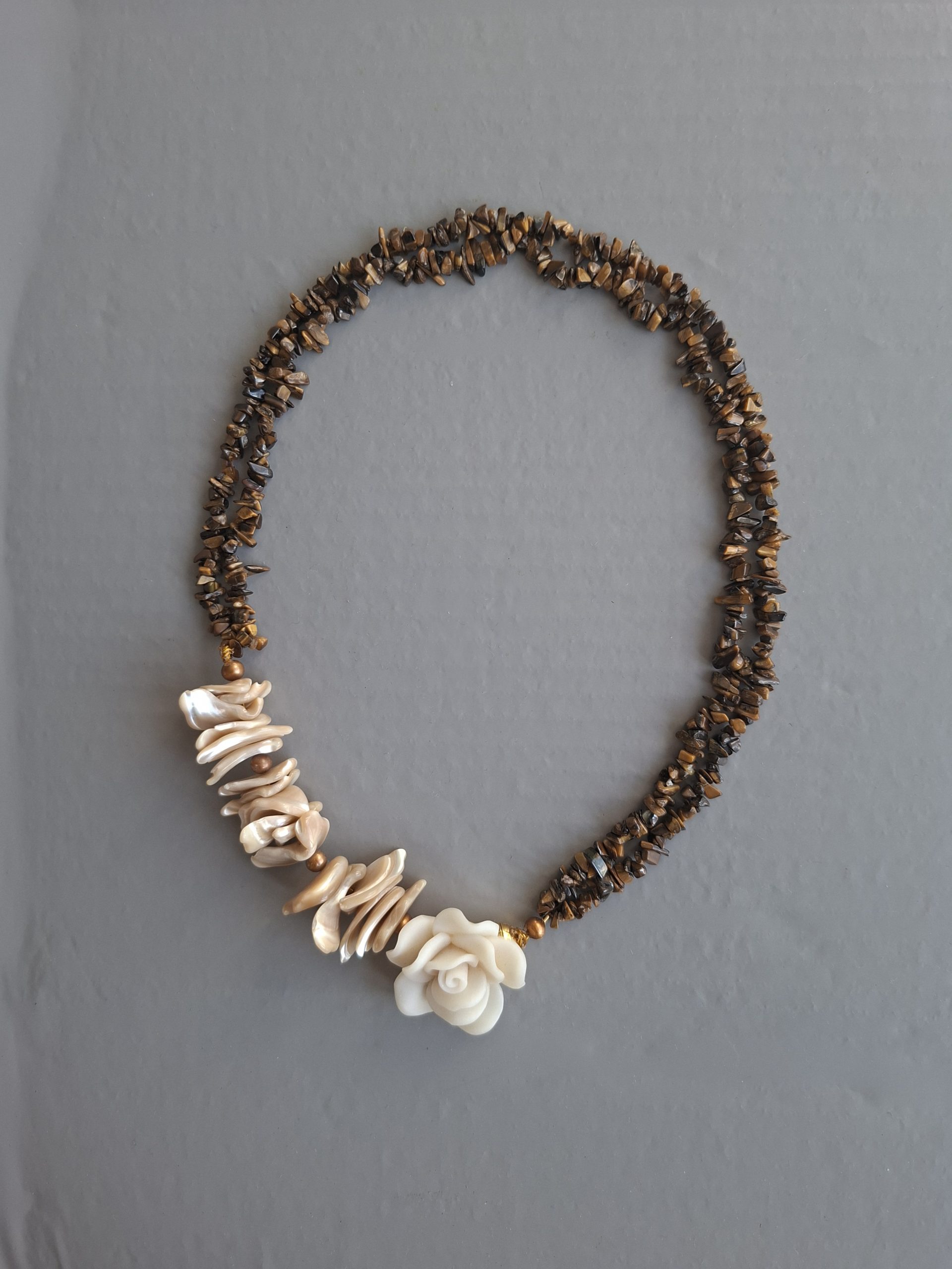 Sehr elegante, asymmetrische Halskette mit Muschelstücken und Tigerauge-Splittern (fördert Selbstsicherheit, Scharfsinn und intuitives Verstehen, lindert Stress) und weißer Rose (Symbol für Liebe, Loyaliät und Vertrauen)