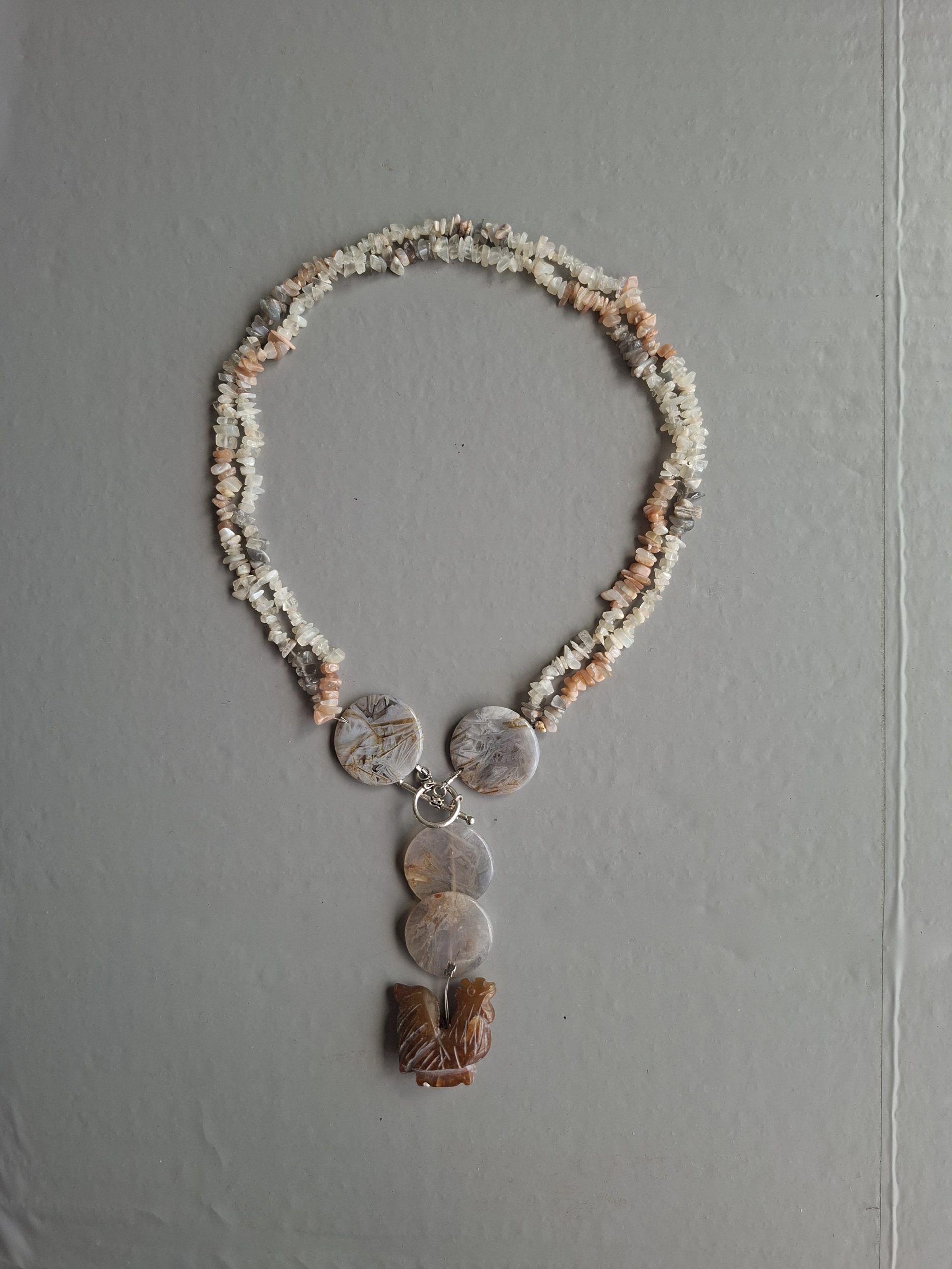 Sehr attraktive Halskette aus Edelsteinsplittern, Achat-Flachperlen (hat beruhigende und schützende Eigenschaften, stärkt das Bewusstsein und den inneren Frieden, Talisman für Reisen und Neuanfänge) und chinesischen Huhn (Symbol für Wohlstand, Fruchtbarkeit und Schutz) als Glücksbringer, mit Vorderverschluss